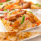 Chicken BiryaniDelicious combination of chicken and basmati rice, traditional hot spices with garlic, ginger, tomatoes and yogurt cooked in Pakistani style