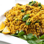 Lamb BiryaniDelicious combination of lamb and basmati rice. Traditional hot spices with garlic and ginger, tomatoes and yoghurt cooked in Pakistani style